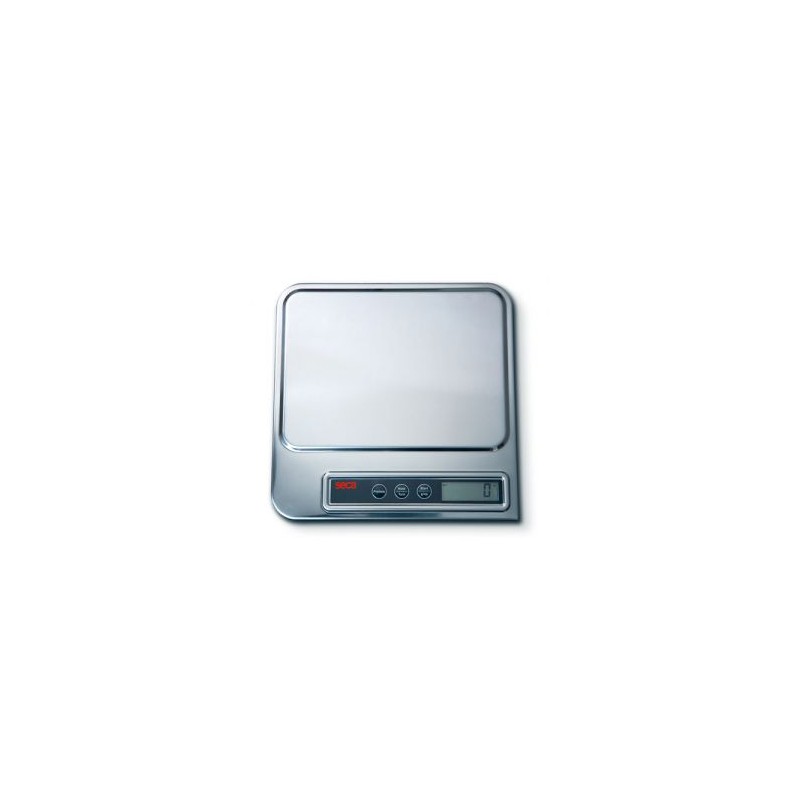El sector elevado de la pantalla la protege contra los ensuciamientos por líquidos y un compartimiento de pilas con sellado especial evita la penetración de humedad en los componentes electrónicos. La báscula también satisface perfectamente las exigencias higiénicas: la superficie robusta y sellada de acero fino se puede limpiar con absoluta facilidad. La función pre-TARA permite comprobar la tara de los recipientes para obtener así un peso neto exacto, que podrá registrarse con una enorme precisión gracias a la división en fracciones de 1 gramo.